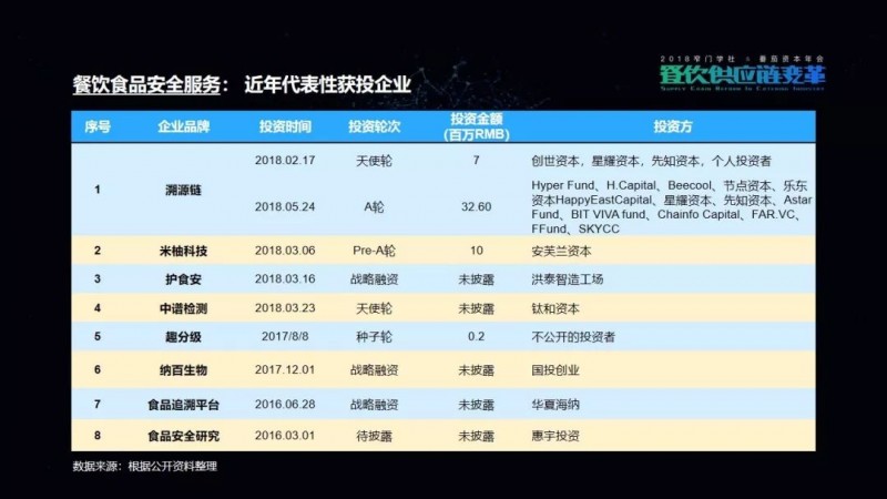 供应链中的食品安全企业,以米柚科技、溯源链为代表,我们也列举了8家获得投资企业的代表。食品安全领域需求巨大,建议投资人可以多关注。
