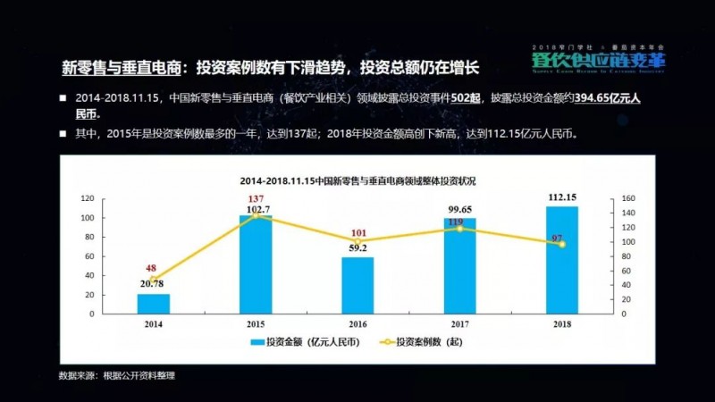 2014-2018年餐饮新零售与电商领域披露总投资事件502起,披露总投资金额约394.65亿元人民币。