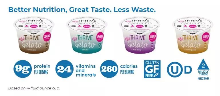 Thrive gelato 主要是针对医院、高级护理和康复设施、学校和体育营养的餐饮渠道提供产品。不过消费者也可以在网上进行订购,售价为每箱58.17美元,包含36盒4盎司包装的冰淇淋。