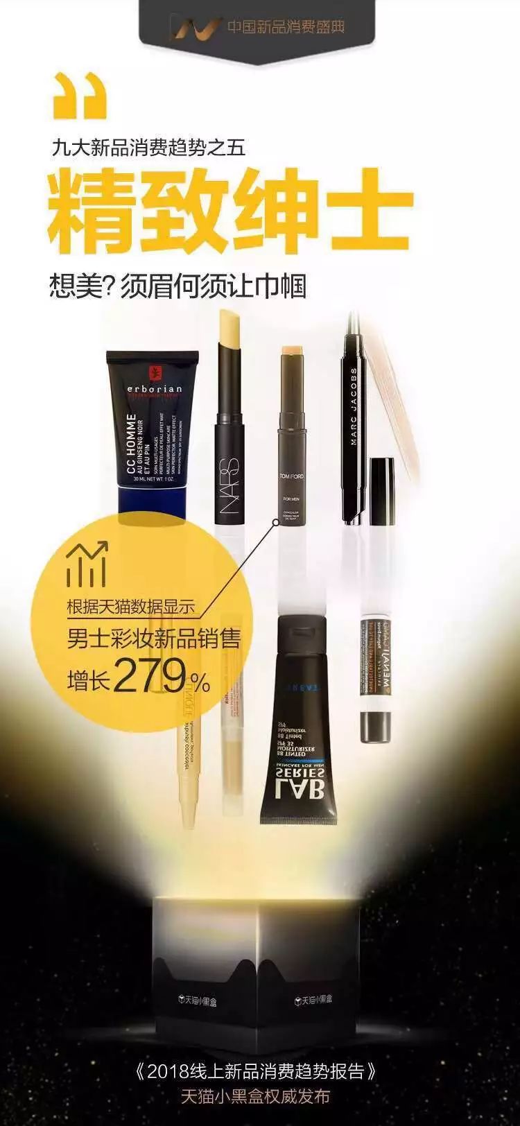 “大女主”意识和“男色消费”的崛起,令男性开始注重外在保养。男士彩妆/护肤成为新品成长最快的美妆类目之一,购买人数与购买件数都明显提升,其中男士彩妆新品销量增长279%,男士乳液面霜销售增长114%。