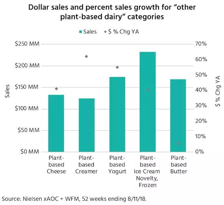 尼尔森数据显示,截至2018年8月11日的52周内,所有食品零售商出售的植物基酸奶销售额同比增长54%,尽管整体市场规模仍然较小(仅为1.74亿美元),但增长潜力是巨大的。