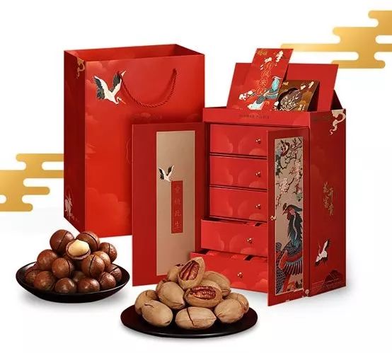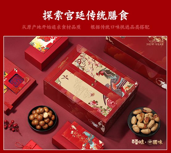 百草味此次联手颐和园,主要推出了两大IP礼盒:富贵花开和八方潮盒。其中,“富贵花开”的整体设计以颐和园中的藏紫檀雕龙纹顶箱小立柜为蓝本,礼盒整个外观为柜型,外柜雕云龙纹,同时加入凤纹、祥云等富有寓意的百鸟朝凤图。而“八方潮盒”异曲同工以史料为证:在古代有许多周边国家会将精致的点心作为每年岁贡给优秀国家的礼品,其中进贡给皇帝的食品包含核桃仁、松仁、榛人等各地美味。