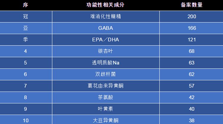 在备案产品的功能性相关成分排行榜上,居首位的是“难消化性糊精”,使用该成分的备案产品达200件,约占总备案数的13%。其次为GABA、EPA/DHA、银杏叶、透明质酸Na、双歧杆菌、葛花由来异黄酮、茶氨酸、叶黄素、大豆异黄酮。