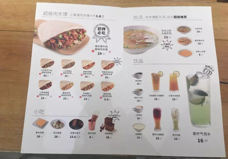 菜单整体以九种口味的肉夹馍搭配“小吃+热汤+饮品”呈现,包含水盆羊肉、嫩豆腐肉汤、燕麦小米粥和咖啡等7款饮品,以搭配肉夹馍的口感。