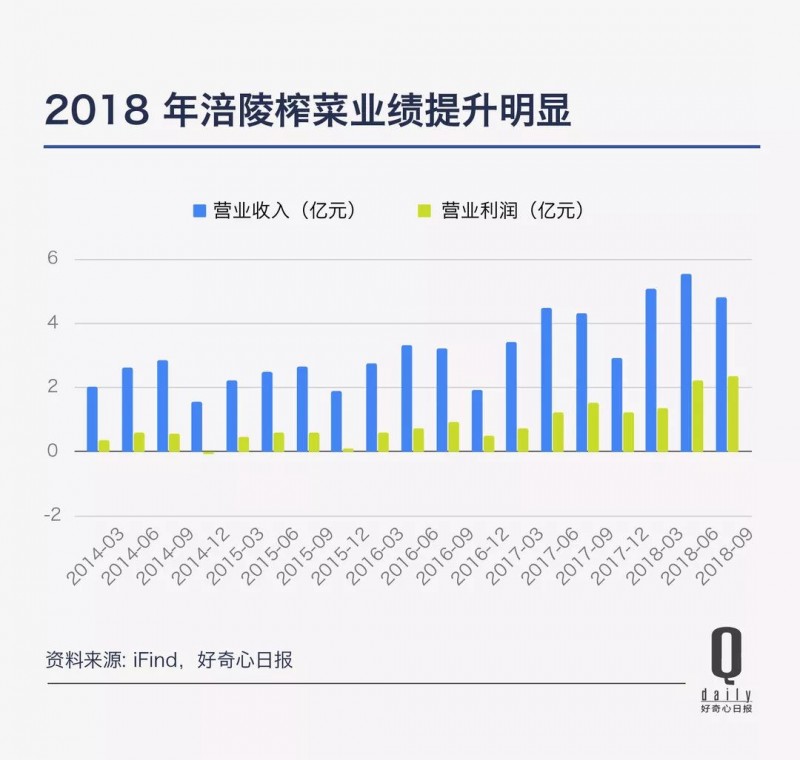 根据财报数据,涪陵榨菜 2018 年一季度实现营业收入 5.07 亿元,较上年同期大幅增加 47%。到三季度的时候,它年内累计的营业收入已经超过了 2017 年全年,并且取得单季 4.81 亿元营业收入、2.34 亿元营业利润、利率润接近 50% 的业绩。