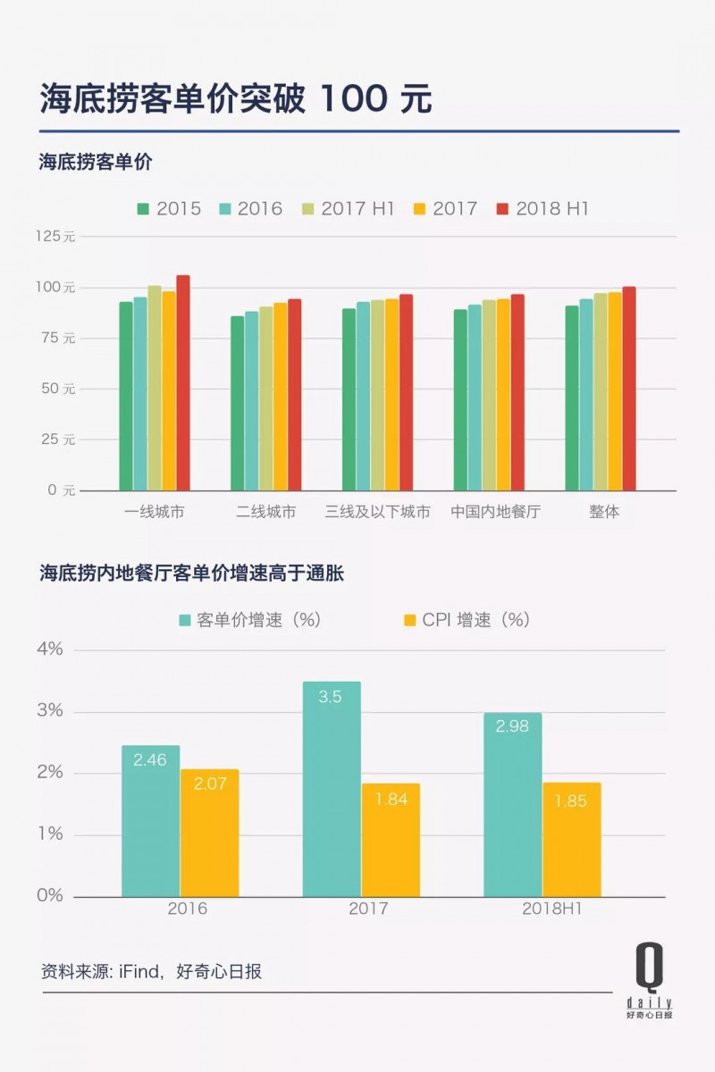 目前中国餐饮业规模推高到 3-4 万亿元级别。作为中国市值最高的上市餐饮企业,海底捞跟上了这一轮中国消费者吃饭习惯的普及。2018 年上半年,海底捞整体客单价突破 100 元,二线城市贡献了最大的增长动力。但是海底捞的隐忧是,它新开门店每天每桌就餐次数的增长明显弱于旧门店。而这些门店又主要是在二三线城市,这说明至少目前在这些城市,这个中国最大的餐饮企业没能获得它期待的增长。