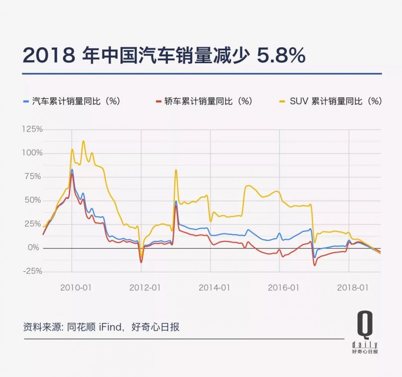而 2018 年的衰退也正是因为 SUV 销量的滑坡。2018 年第三季度,SUV 销量增速大幅落后于轿车和整体乘用车,7 月同比减少 8.5%。过去十年里中国汽车市场最重要的增长引擎熄火,并拖累中国乘用车月度销量下滑。
