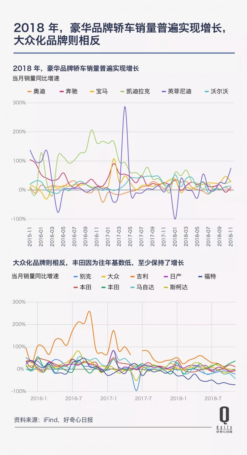 《好奇心日报》汇总了奥迪、奔驰、宝马、英菲尼迪等一二线豪华品牌销量,发现这些品牌在 2018 年大多数月份里都实现了销量的同比增长。恒大研究院的一份报告也体现类似的趋势:去年前三季度,奥迪 A6、皇冠、宝马 5 系、奔驰 E 级、凯迪拉克 XTS 合计增速 17.1%,跟汽车整体 -0.6% 的负增长反差明显。