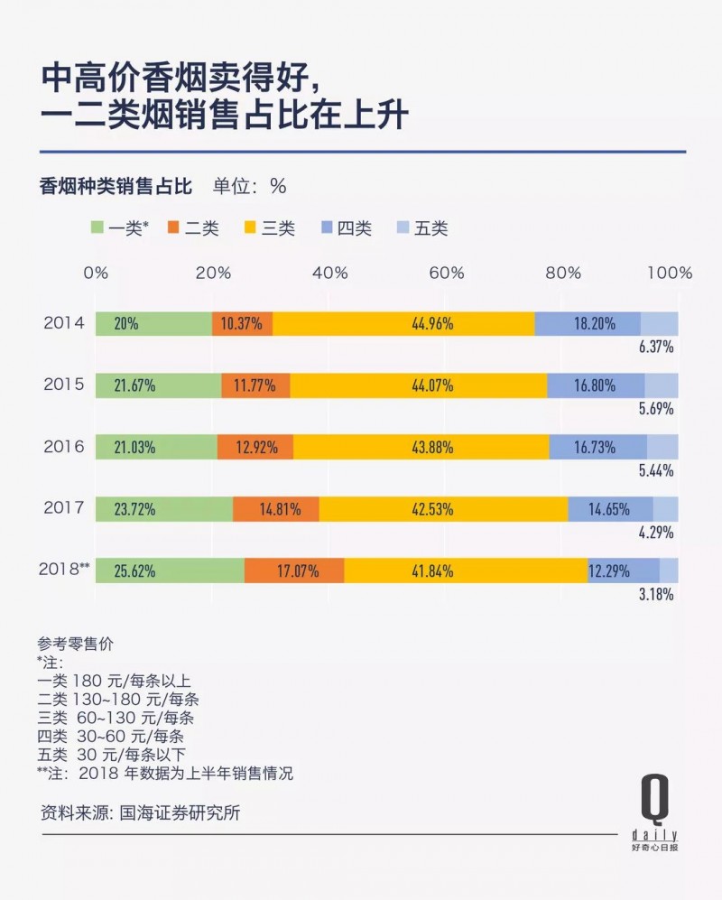 包括农村地区消费者在内,整体烟民消费结构的上移,导致单包 6 元及以下的低档烟占比则进一步下降至 15%。