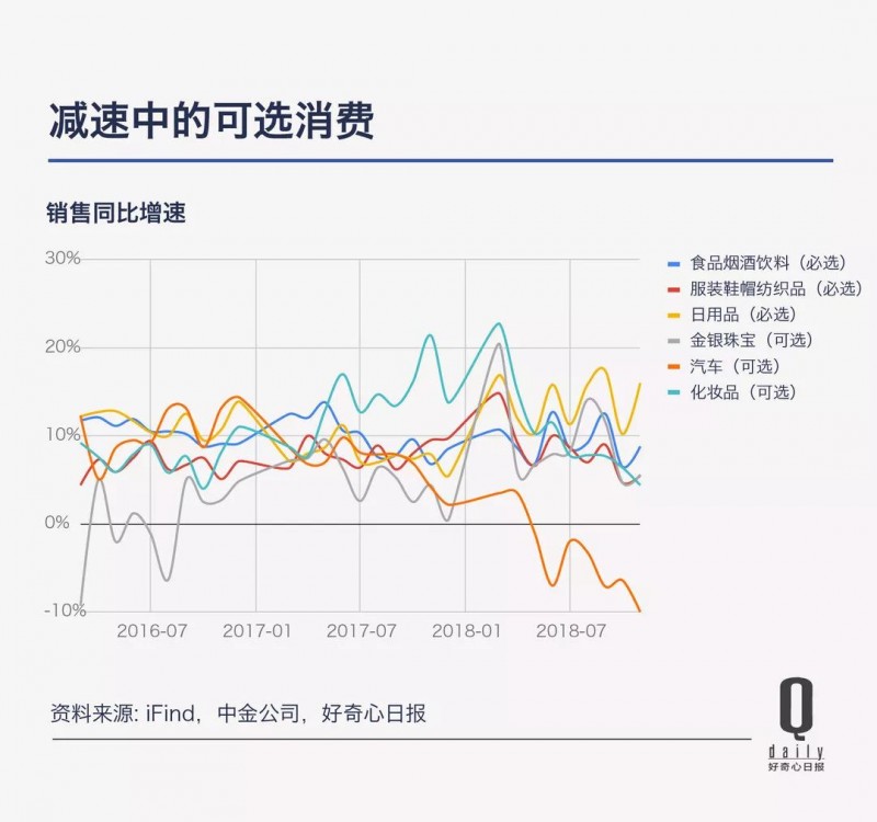 《好奇心日报》分别选取上述商品分类作为必选和可选消费增长的观察样本,发现 2018 年年初,金银珠宝和化妆品曾实现 20% 以上的销售增速,领先于“必选消费”品类下的食品烟酒和服饰鞋帽。但是自 2018 年下半年起,可选消费减速、必选消费企稳,两类消费走势分化。
