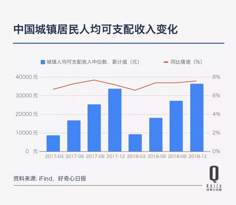 中国国家统计局的数字也能说明这一问题。2013 年,中国居民人均可支配收入中位数增速约为 10.9%,2018 年年末掉到了 6.5%。
