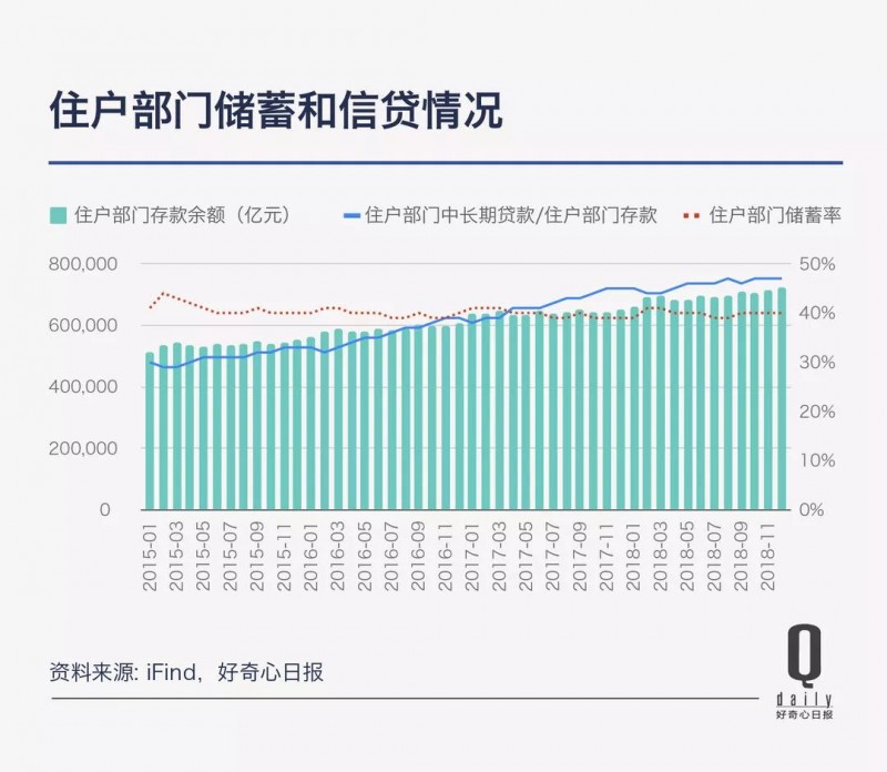 这些变化都有可能反过来刺激居民储蓄动机。2017 年年底以来,中国城镇家庭储蓄存款比例从 40% 提升至 2018 年年底的 44%。储蓄增多,借贷减少,消费也就自然少了。