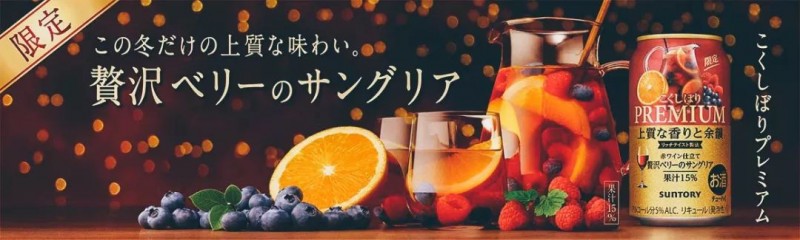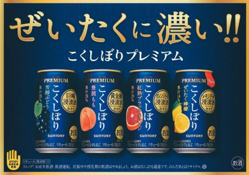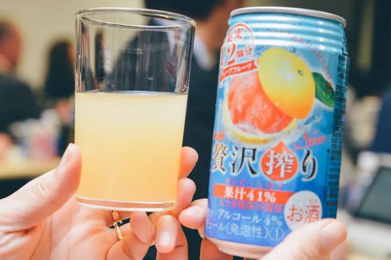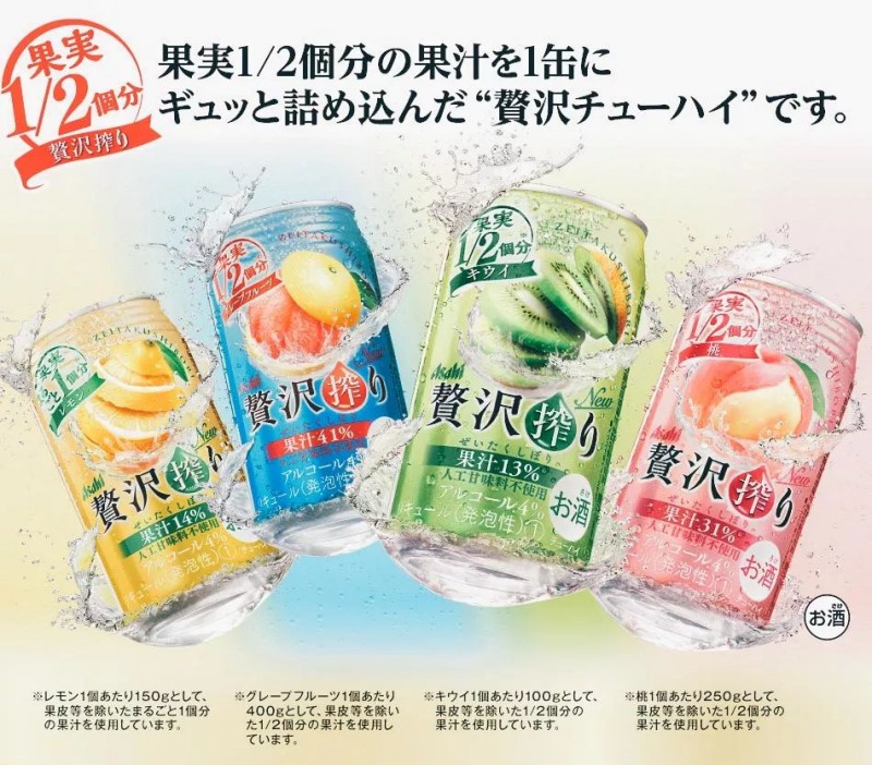 贅沢搾り的意思是奢侈果实烧酒,主打一瓶酒使用 1/2 颗以上果实的果汁,不添加人工甘味剂,所以糖分和热量都很低,正顺应了全世界流行的健康饮料风潮。