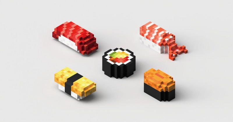 通过 3D 打印技术,造出很多长宽高均为 5mm 的小凝胶,像乐高积木一样堆砌起来,拼成一块像素风寿司。