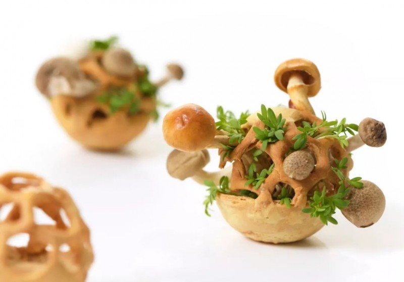 在一个 3D 打印出来的面粉小球里,注入种子、胚芽、蘑菇孢子等,会在 5 天内成长发芽,并从缕空的小孔中冒出。