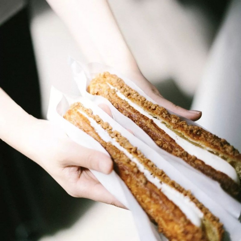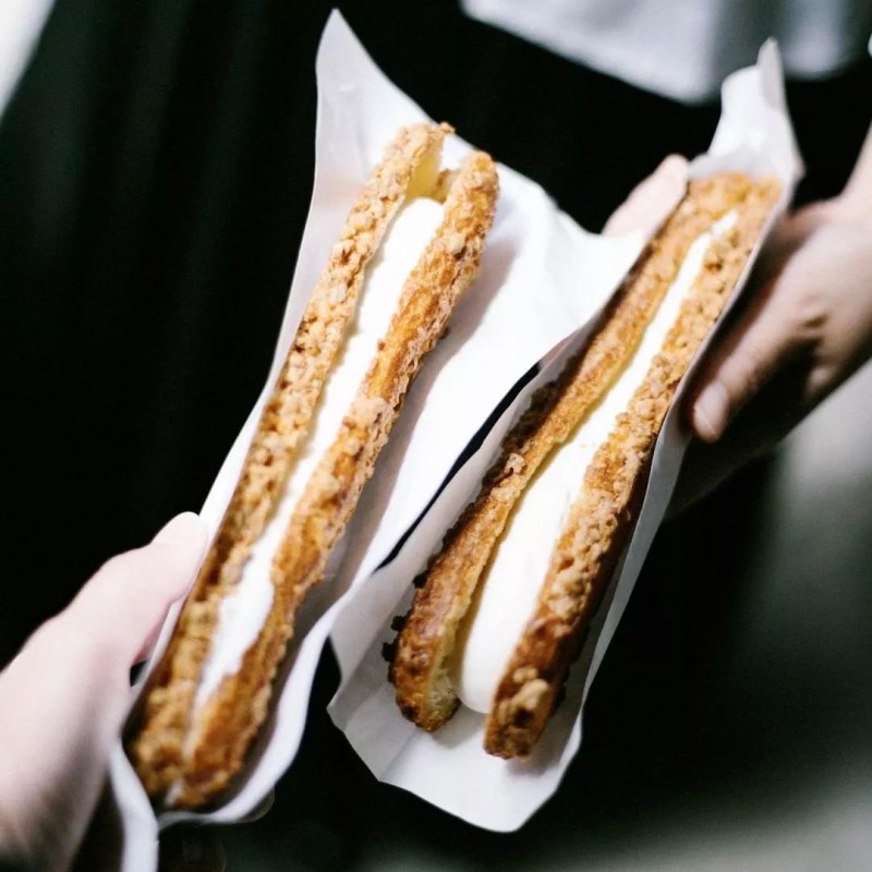 长条状的泡芙,外层裹着酥脆的杏仁粒,再加上浓郁的牛奶冰淇淋。