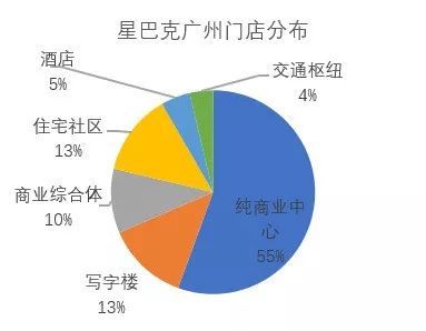 再看看上面的数据,星巴克在广州市场的分布以商业中心为主,办公和商业合起来有78%,住宅区只有13%,住宅社区的门店数量少,一定程度上说明咖啡消费并不是日常生活所需,只是在人流量大的商业和办公,成为社交、约会的场地。