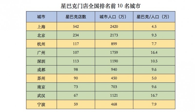 截止到2018年12月,星巴克进入中国也有近二十年的时间了,从这些年星巴克在全国开店数据可以看到,其在国内店数分布差距非常大,上海542家门店,平均4.5万人拥有一家星巴克,北京是9.3万人,深圳10.5万人,广州16万人才拥有一家星巴克。同期韩国首尔平均1.1万人拥有一家星巴克,我们国家相比星巴克的密度很小,而且分布不均。
