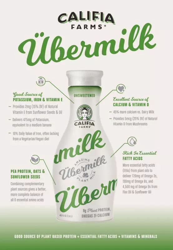 近日,植物基明星品牌Califia Farms推出了一款强化蛋白质和微量营养素的植物燕麦奶Übermilk,有三种风味可供选择。