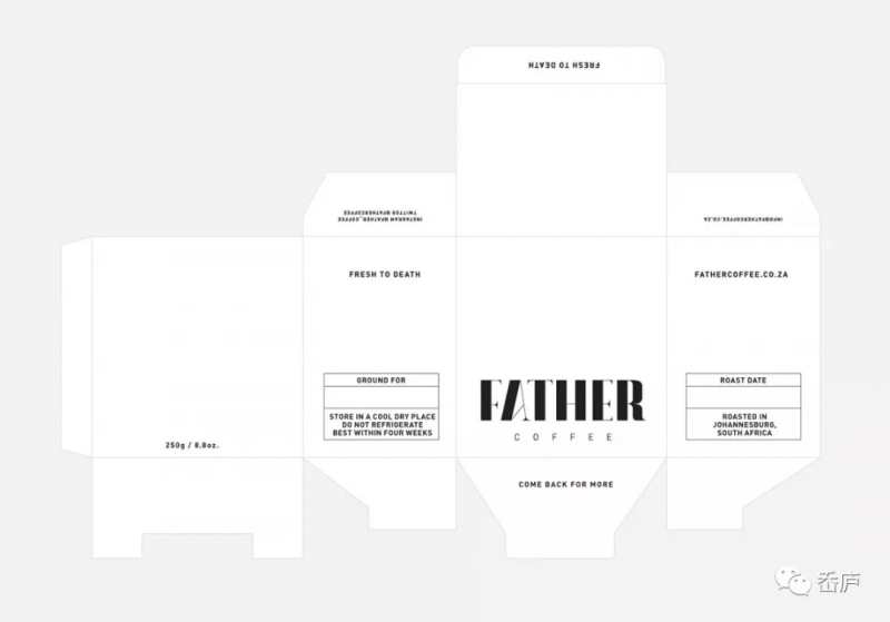 来自南非约翰内斯堡的Father Coffee的这组咖啡豆包装相当成功。因为考虑到产品主要面向家庭型消费者,所以并没有选择过于花哨的设计。盒身形状普通,既不出挑、也不炫目,让人有种归家的踏实感觉。
