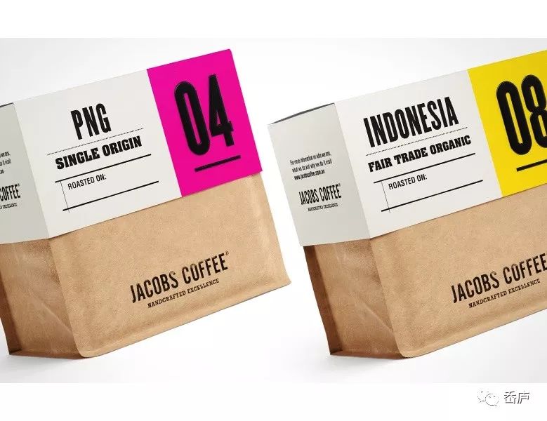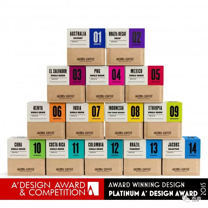 另一个品牌Jacobs Coffee,以方形色块搭配数字为醒目的标识打造了系列性咖啡豆产品。不同数字对应世界各地的咖啡产区,让人忍不住想依照数字顺序一盒一盒买下去,似乎不出家门也能环游世界呢。