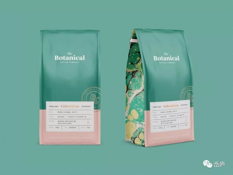 英国的咖啡品牌Botanical Coffee Co. 的产品就是直接以自然元素为卖点。咖啡外包装采用清爽的粉色与绿色搭配。在纸袋的侧面、易拉罐的罐口处配上象征大自然的纹理图案,表达“自然植物咖啡”的健康理念。