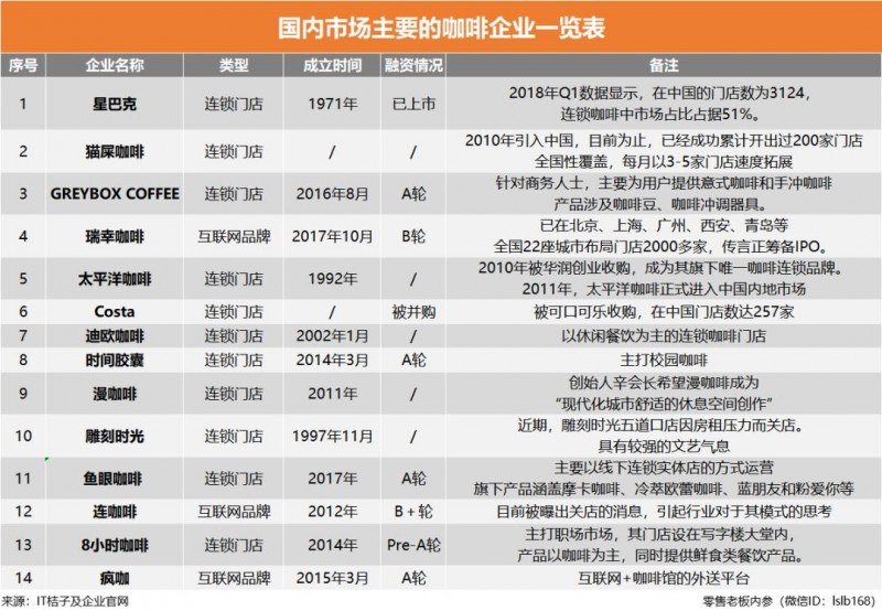 目前,国内有星巴克、Costa为代表的咖啡店。有7-ELEVEn、全家为代表的便利店咖啡。也有麦当劳、肯德基为代表的连锁餐厅。还有瑞幸、连咖啡为代表的外卖式咖啡。