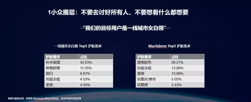 一二线白领女性的护肤需求是什么?从需求程度轻重依次排序来看,分别是补水保湿、修复舒缓、美白、抗痘去痘、紧致。这是一个比较大众的需求,所有品牌都在试图满足这些需求,但是网红品牌Martiderm不一样,它满足的需求依次是提亮肤色、抗痘去痘、紧致、抗氧化。