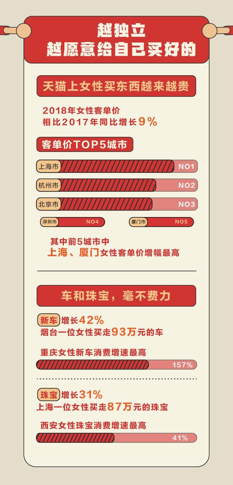 要独立,首先得有经济实力。这两年,天猫上的女性消费客单价逐年增高,2018年同比增长8.85%。准一线城市女性消费力直逼北上广,其中客单价最高的城市分别是上海、杭州、北京、南京、厦门,广深跌出前5;而增速最高的,要数上海和厦门。
