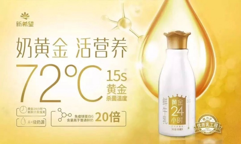 新希望的“黄金24小时”,突破了技术壁垒,采用A+级远高于欧盟标准的优质乳奶源+72℃15秒的黄金杀菌温度以及24小时的黄金保险时间,也是为更好地保留牛奶中的活性营养。