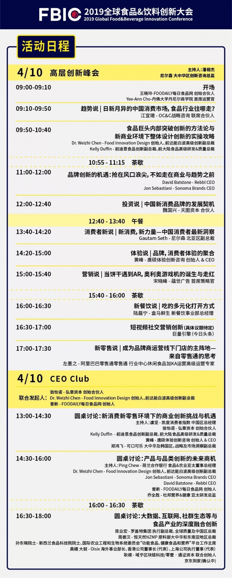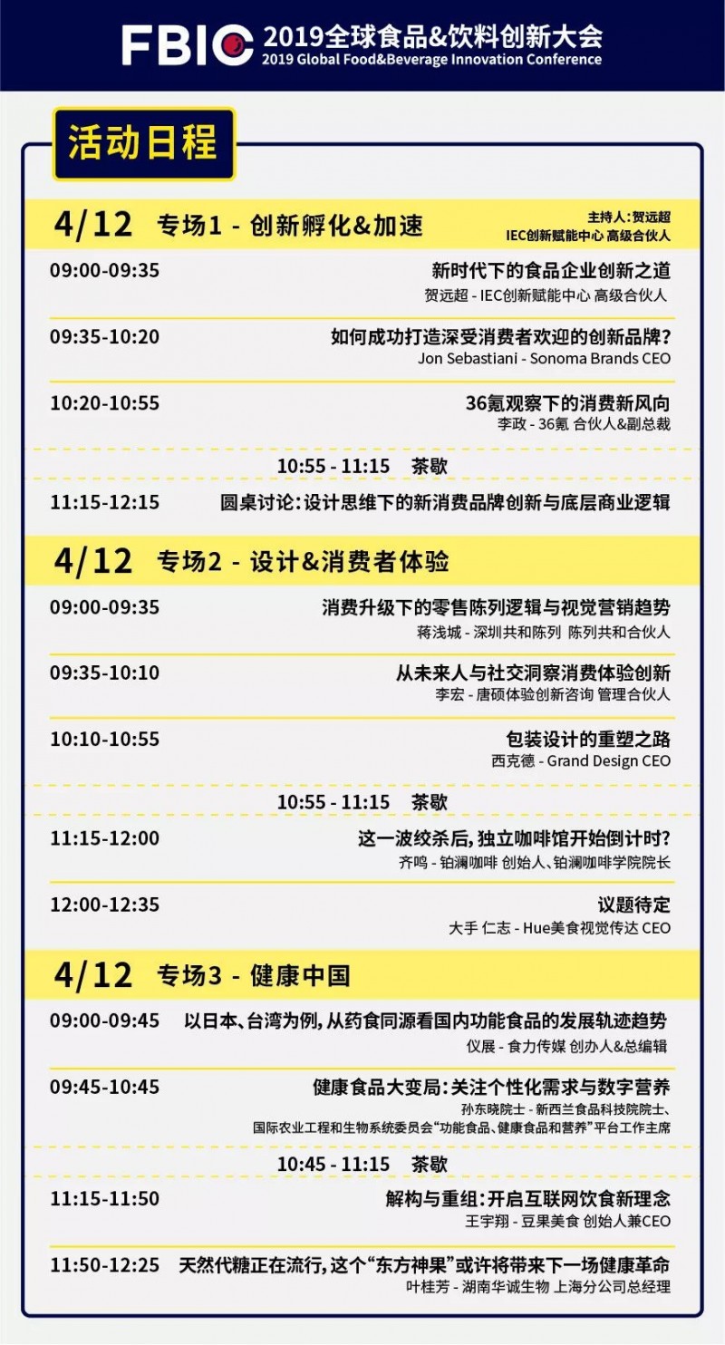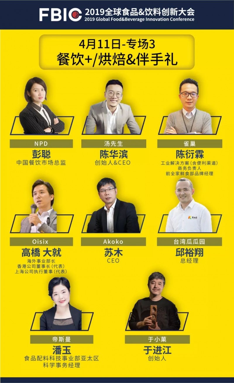 我们始终聚焦“产品&创新”,着眼C端到B端,致力于让每一位参会嘉宾身临其境地去体验并发掘一个个商业机会,并寻找到相应的解决方案。因此2019FBIC将以“全球创新产品体验+创新峰会+CEOClub+ISee新消费创新产品奖+食物春潮体验快闪”的形式,深度解读消费者、市场、技术、产品、品牌、体验等创新案例,以达到加速食品行业产品创新,构建产品决策人的创新社交的目的。这一次,我们将打通产品创新的全链条,从CEO到消费者。