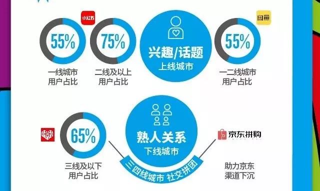 从尼尔森数据可以看到,三四线城市的市民更习惯于熟人消费,几人拼单的消费模式是他们更习惯的。而一二线城市则更习惯于兴趣社交来促进消费,例如小红书一类的种草型社交平台。