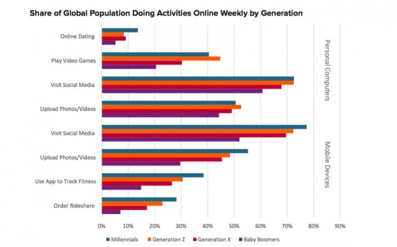 根据Euromonitor公司的数据报告显示,全球范围内,45%的人每周分享照片或视频。其中无论是使用电脑还是手机、无论是哪一个年龄段,浏览社交媒体都是最常进行的互联网活动。