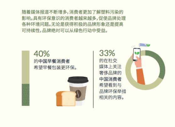 Mintel 在报告中提到,更环保的包装材料,会笼络大量消费者的心。40%的中国早餐消费者希望早餐的包装能够更环保,33%在社交平台上关注奢侈品品牌的消费者,希望品牌能够有环保的设计和意识。
