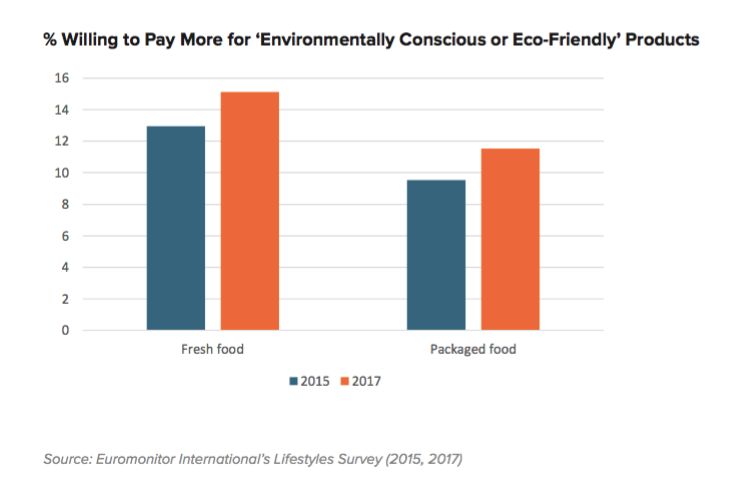 而Euromonitor则表示,消费者愿意为环保的、可以回收的产品支付更多的费用。