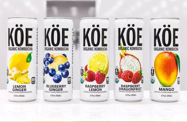 KOE公司推出的有机康普茶,主打柔和概念,弱化了传统康普茶带来的不愉悦酸味,旨在设计为一款糅合康普茶、碳酸饮料、茶、果汁以及其他新品类饮料的康普茶饮品。