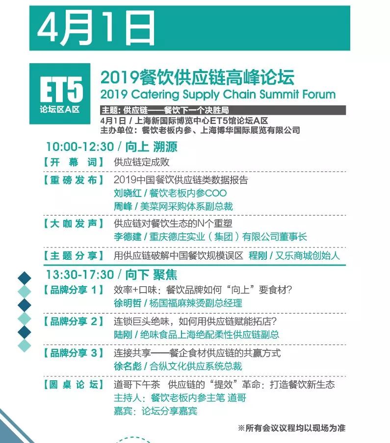 作为中国餐饮行业风向标的展会HOTELEX始终关注中国餐饮业发展动态,为此联合餐饮老板内参共同举办,由餐饮老板内参COO刘晓红,并邀请重庆德庄实业(集团)有限公司董事长李德建、美菜网采购体系副总裁周峰、又乐商城创始人程刚、杨国福麻辣烫副总经理徐明哲、绝味食品上海绝配柔性供应链副总陆刚等行业知名人,共同探讨供应链新的增长点。