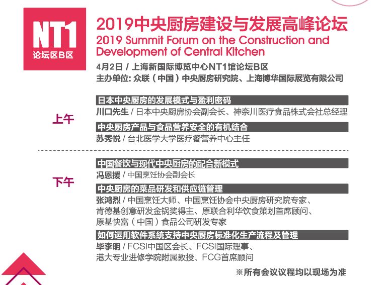 为顺应时代发展需求,中央厨房正以高度集中化的姿态得到全方位关注,由日本中央厨房协会副会长川口先生、台北医学大学主任苏秀悦、 中国烹饪协会副会长冯恩援等出席,将聚焦中央厨房”中央厨房的建设规划”、”中央厨房的运营管理”、“中央厨房的菜品研发”以及”未来发展与盈利模式”等问题,深入探讨,引进海外先进案例,从可持续性角度出发,放眼未来,为亚太区餐饮业主和设备供应商提供第一手解决方案和市场动向。