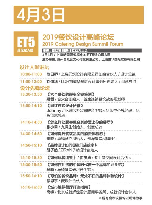 由合众合、上瑞元筑、LDH刘道华建筑设计、叁上叁、亚洲吃面公司、汤姆马克、ZIRAN子然设计、九月生、马骑餐饮研习社、麦设计、成就设计,11家设计公司累计为1000+餐饮品牌服务,超强阵容及服务案例大曝光!针对如何将好创意和好设计转化为好生意,展开多角度、全方位的思考和探讨。