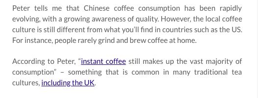 不久之前,我从Perfect Daily Grind网站上看到一篇题为【Exploring The Chinese Coffee Industry, From Roasters to Consumers】的文章,其中写了这样一句耐人寻味的话:「虽然每天都可以听到中国精品咖啡崛起的故事,但现实情况是速溶咖啡和低品质咖啡仍在中国咖啡市场上占据绝对地位。」