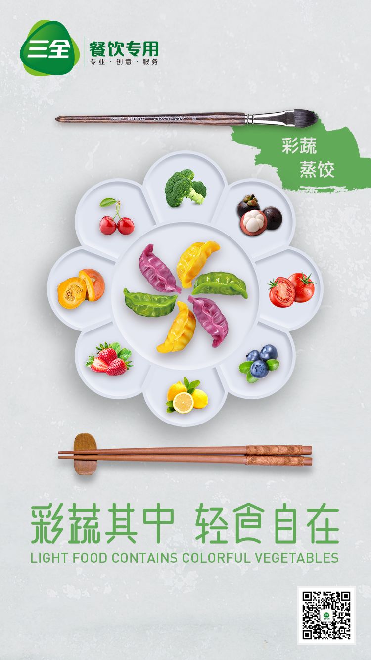 彩蔬其中,轻食自在——三全餐饮彩蔬蒸饺的全新理念。在食材选择上,原产加拿大,跨越7723Km采自中粮的优质小麦粉,不添加色素,100%果蔬入面制成菠菜皮、南瓜皮、紫薯皮,对应着韭菜鸡蛋馅、什锦三丝馅和荠菜罗汉笋馅,颗粒感分明,吃得到食材本身的口感。
