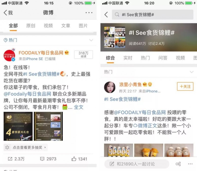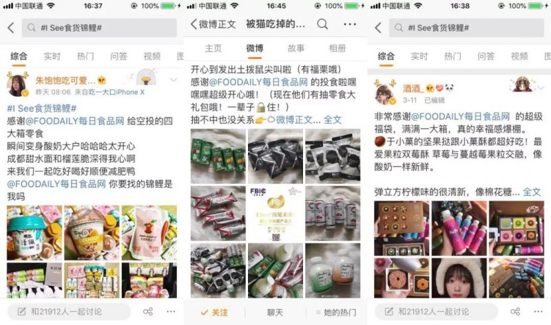 为了获得超级消费者的体验评价和大众消费的社交口碑发酵,Foodaily特别通过新浪微博平台开启了#I See食货锦鲤#的线上活动。目前共有近100位美食KOL参与互动体验,预估约会有200位美食达人、KOL参与#I See食货锦鲤#的产品测评与体验…
