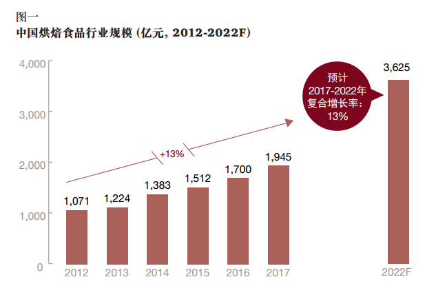 中国烘焙食品行业在2013-2017年经历了高速增长,年复合增长率达13%。2017年包括面包、蛋糕、糕点等在内的总销售量达9940万吨,总销售规模达2000亿元(见图一)。