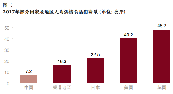 与此同时,中国人均烘焙食品消费量只有7.2公斤,与欧美国家尚存在较大差距。由于饮食习惯的不同,欧美国家以烘焙食品作为主食,中国以米饭、面食类作为主食,因此中国人均烘焙食品的消耗量只有美国的六分之一、英国的七分之一。与饮食习惯较为接近的日本和香港相比,中国的人均消费量依然只有香港的二分之一、日本的三分之一,这说明中国的烘焙食品消费能力存在较大的增长空间(见图二)。