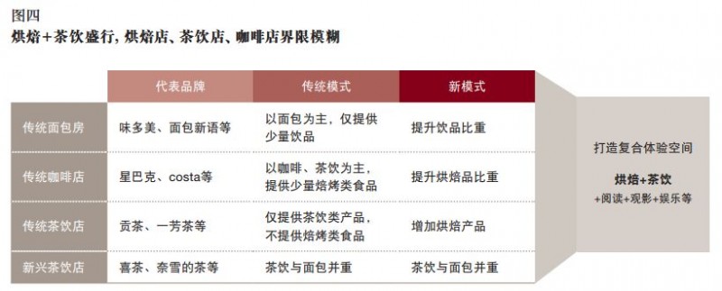 奈雪的茶、喜茶为代表的新锐面包茶饮店带动了“烘焙+饮品”之风,这种模式改变了消费者“只买饮品”、“只买面包”的消费习惯,而是将二者搭配起来。这看似微小的调整,给中国烘焙市场带来了一波转型潮流,并迅速吸引了一批新的玩家进行拓界尝试。除了空降的新锐面包茶饮店直接将烘焙和饮品并重,过去着重烘焙或者茶饮的玩家也开始调整产品结构,积极向“烘焙+饮品”模式转型(见图四)。