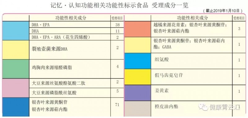 「维持中老年人随着年龄增加而低下的认知功能一部分的记忆力」这类脑健康功能声称的功能性标示食品到今年1月10日已经达到了143种,与去年同期增加46个品种。
