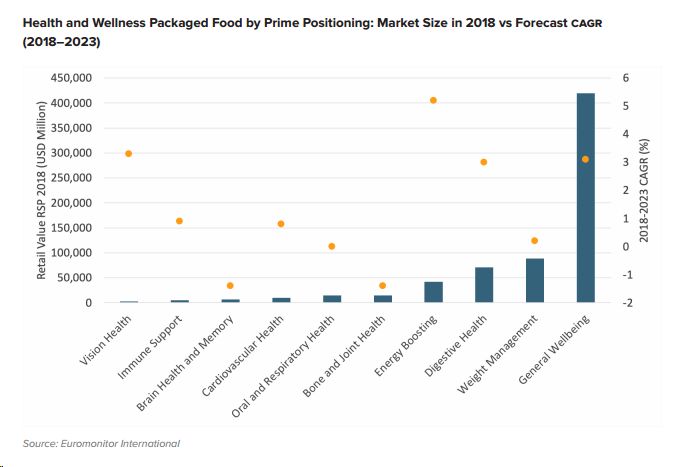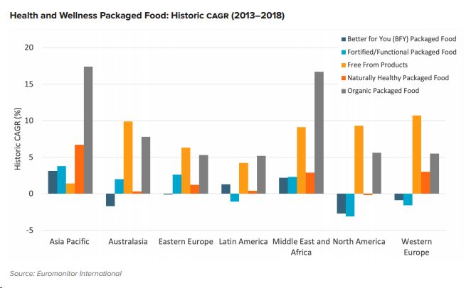 随着全面健康的饮食习惯,消费者对天然食品的热衷度日益升温,使得健康和保健包装食品 (Health and Wellness Packaged Food)的增长速度超过了一般包装食品 (Packaged Food)。这一趋势中受益最大的是有机 (Organic) 和无添加食品(Free From),尤其在西欧和北美等时尚健康饮食习惯盛行的地区。