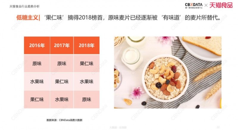 CBNData《报告》显示,低糖食品逐渐进入大众视野,销售额首次呈现了1倍增长,新一线的消费者更喜爱低糖食品同时95后的消费者明显增多,2018年达到最高点且相比其它人群占比最高。果仁味是低糖食品最受欢迎的产品,同时原味麦片已经逐渐被‘有味道’的麦片所替代。