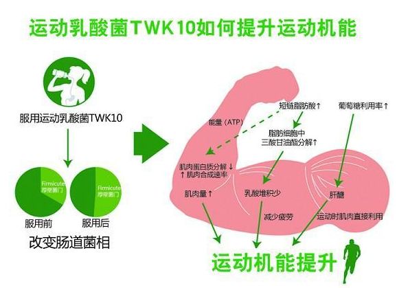 运动益生菌Lactobacillus plantarum TWK10™专为提高人体运动性能而生,筛选来自台湾泡菜,是世界上第一株证实能够强化运动表现和改善体组成的益生菌。历经十年的研究开发,进行一连串完整的动物试验和人体临床试验,证实长期补充TWK10™可改变人体内的肠道菌群(gut microbiota),增加短链脂肪酸,进一步提升肌耐力,增加肌肉质量,降低体脂肪和抗疲劳等效果,延长耐力运动健身时间,改善运动健身性能。