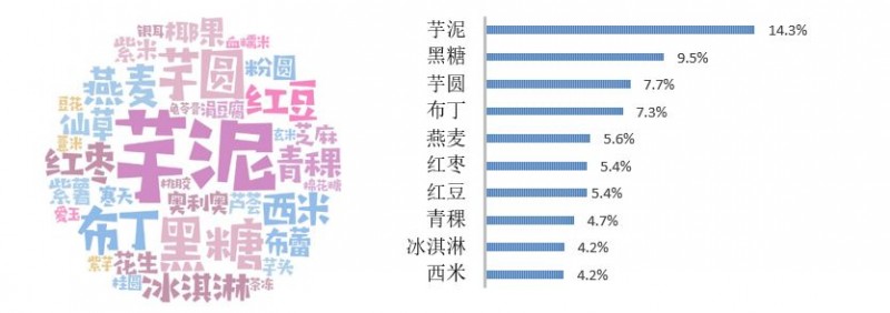 而随着消费者对“刮油”、“抗糖”等话题的关注,主打“纯天然、无添加”的中式配料(红豆、豆花等)活跃于奶茶中,更像是一种心理慰藉,减少因奶茶摄入过量而发胖的负罪感。